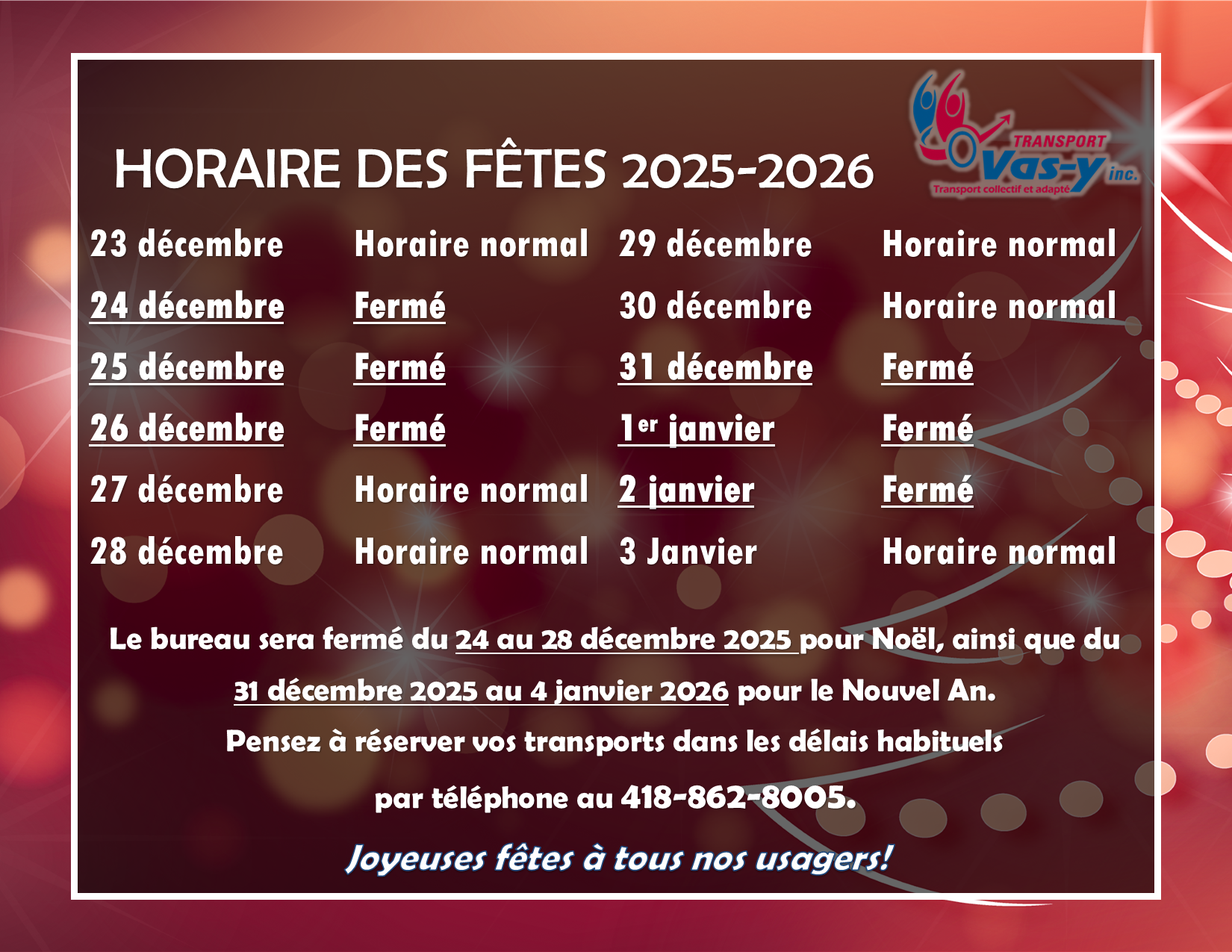 Pour les municipalités environnantes, vous devez annuler votre transport au moins 2 heures avant l’heure d’embarquement et pour les déplacements sur le territoire de la Ville de Rivière-du-Loup.